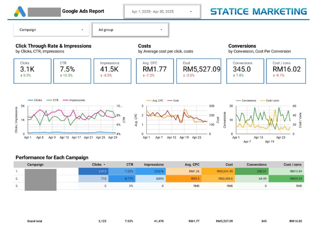 In Apr 2025, we’re able to help our client gain 3.1k clicks traffic to their website, with average cost per clicks of RM1.77.